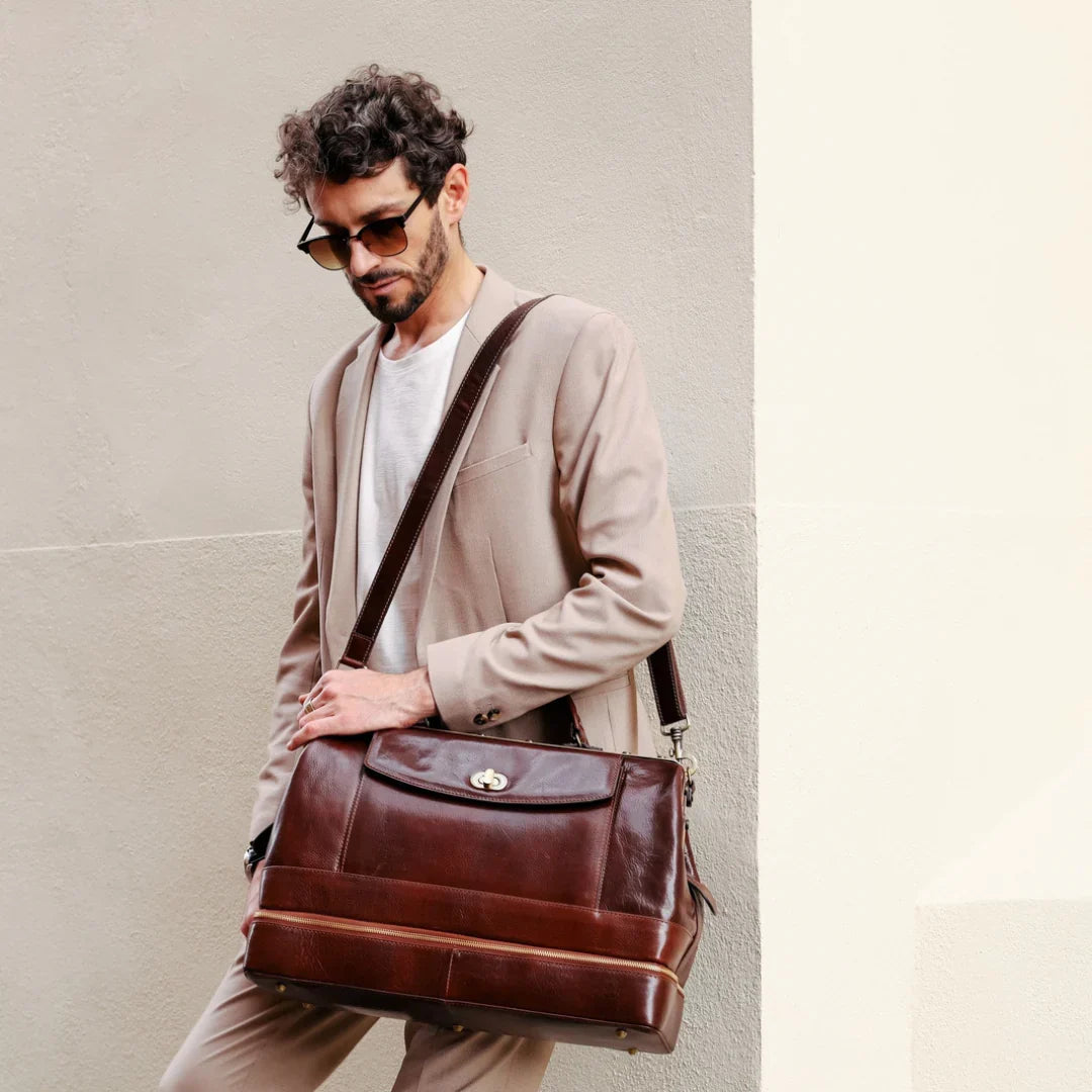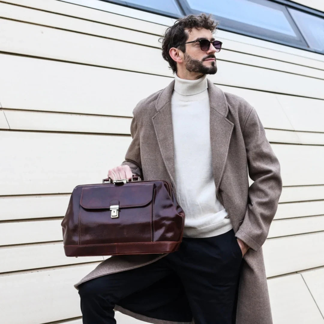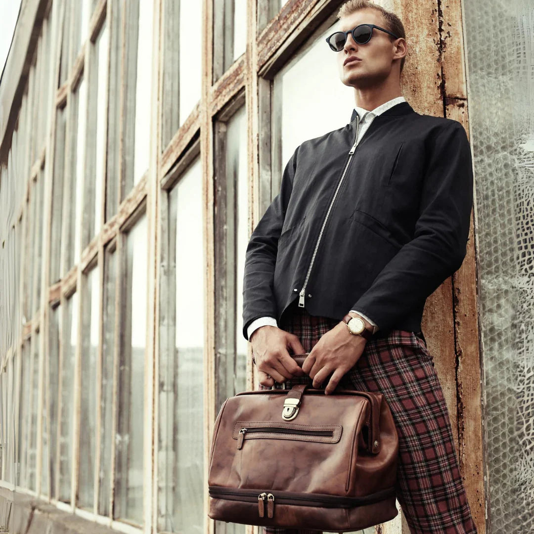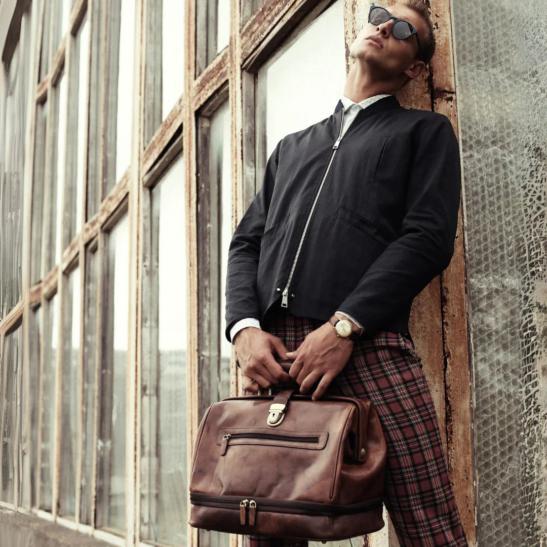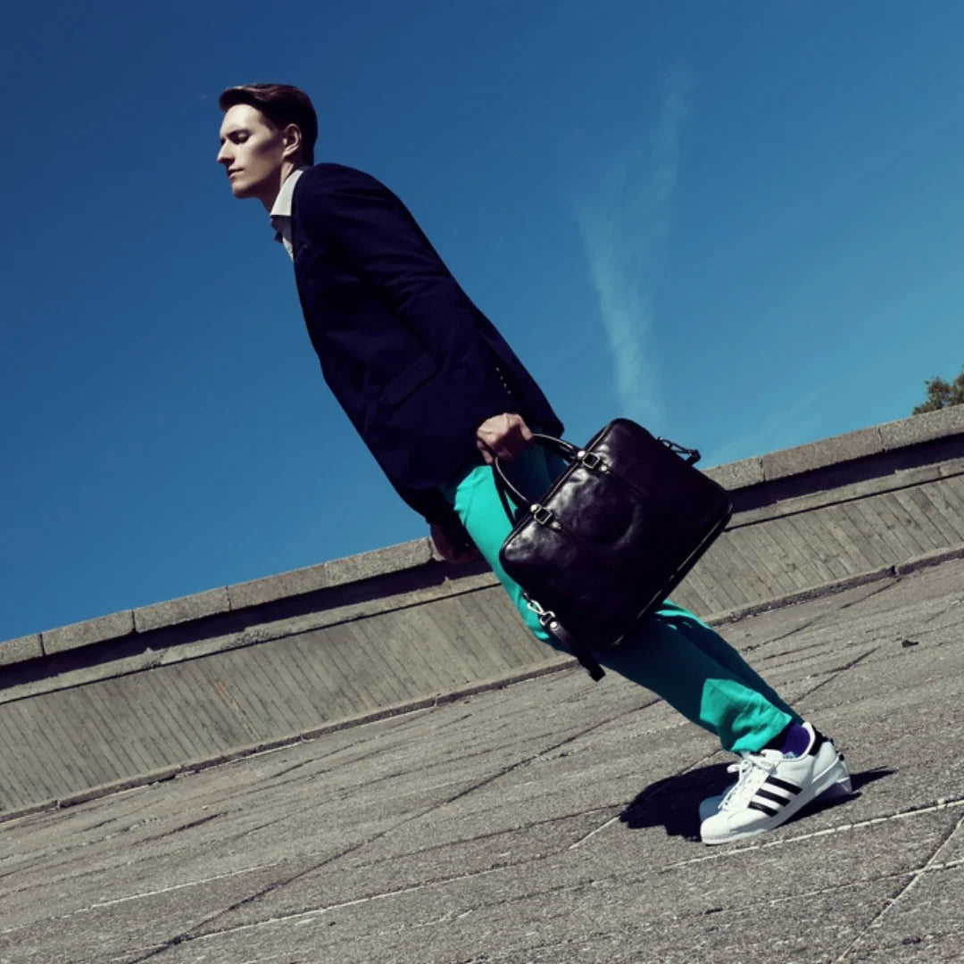 Abbiamo sempre creduto che le borse in pelle dal gusto classico non siano riservate esclusivamente ai formali uomini d’affari: anche chi ha uno stile più disinvolto può indossarle senza rinunciare al proprio carisma. È proprio questo che abbiamo voluto dimostrare con lo shooting "Gli opposti si attraggono". Alcuni scatti sono stati realizzati in un’antica dimora, dove le nostre borse da dottore dal design classico ci hanno fatto viaggiare indietro nel tempo. In seguito ci siamo spostati in uno skate park, non lontano da edifici direzionali, dove lavorano molti giovani come il nostro affascinante modello. Le borse si sono perfettamente adattate al nuovo contesto, trasformando l’uomo in un moderno e audace millennial.