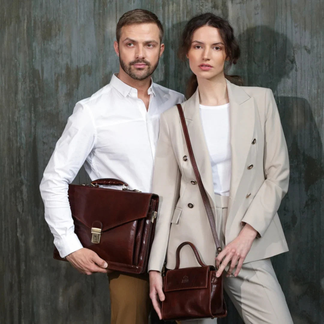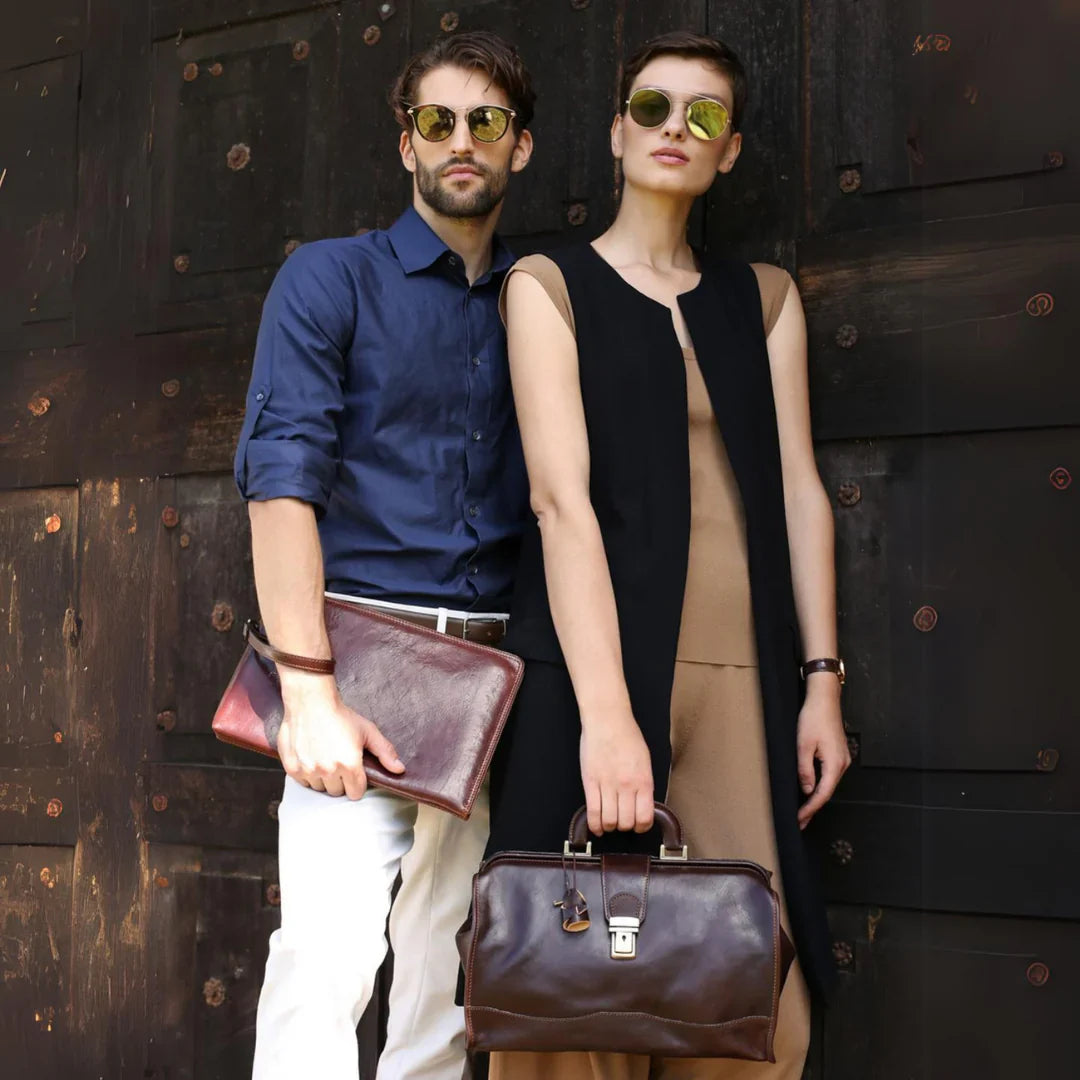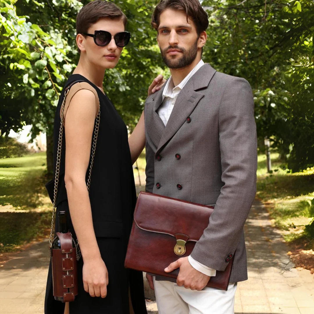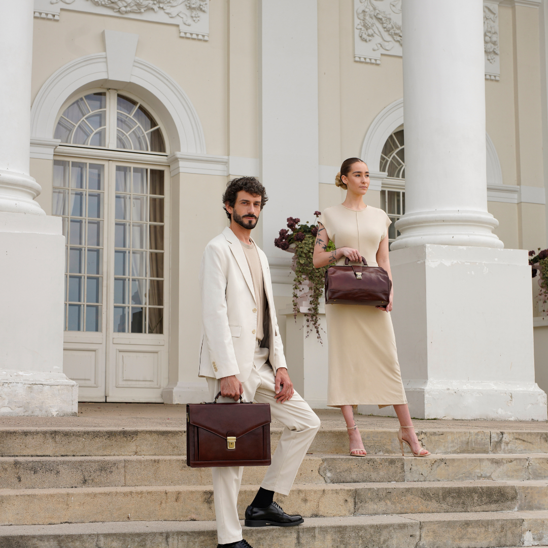 La maggior parte delle nostre borse e accessori è pensata per essere indossata da chiunque, senza distinzioni. Troviamo audace, contemporaneo e affascinante il gesto di una donna che porta con sé una valigetta, anche dalle linee più decise e tradizionalmente maschili: è il segno di una vera leadership. Per questo servizio abbiamo scelto di affiancare modelli e modelle, per mostrare come portadocumenti in pelle, borse da medico classiche e altri accessori possano essere interpretati con naturalezza e stile da chiunque, senza mai sfiorare la caricatura. Una storia antica come il tempo: dopo una giornata intensa, impeccabili nei loro outfit professionali, due persone si incontrano per una fuga romantica.