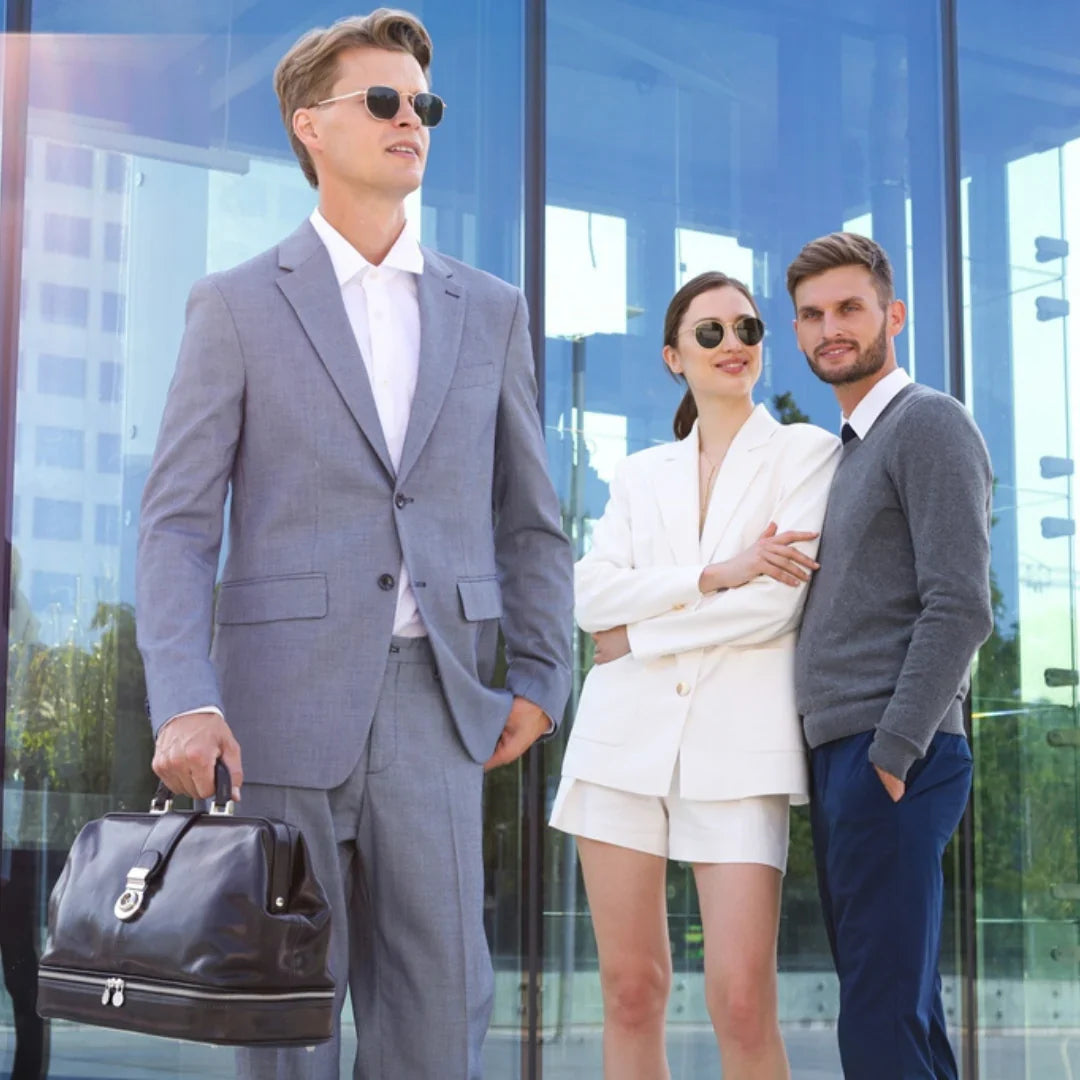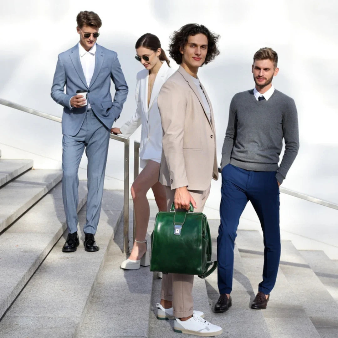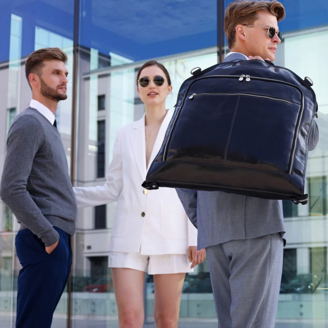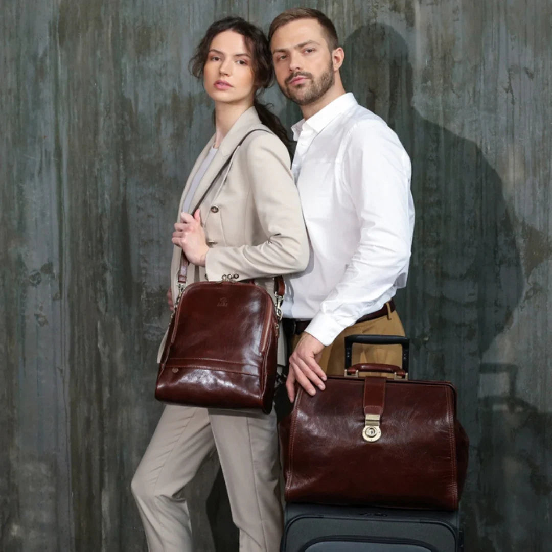 La maggior parte delle nostre borse e accessori è pensata per essere indossata da chiunque, senza distinzioni. Troviamo audace, contemporaneo e affascinante il gesto di una donna che porta con sé una valigetta, anche dalle linee più decise e tradizionalmente maschili: è il segno di una vera leadership. Per questo servizio abbiamo scelto di affiancare modelli e modelle, per mostrare come portadocumenti in pelle, borse da medico classiche e altri accessori possano essere interpretati con naturalezza e stile da chiunque, senza mai sfiorare la caricatura. Una storia antica come il tempo: dopo una giornata intensa, impeccabili nei loro outfit professionali, due persone si incontrano per una fuga romantica.