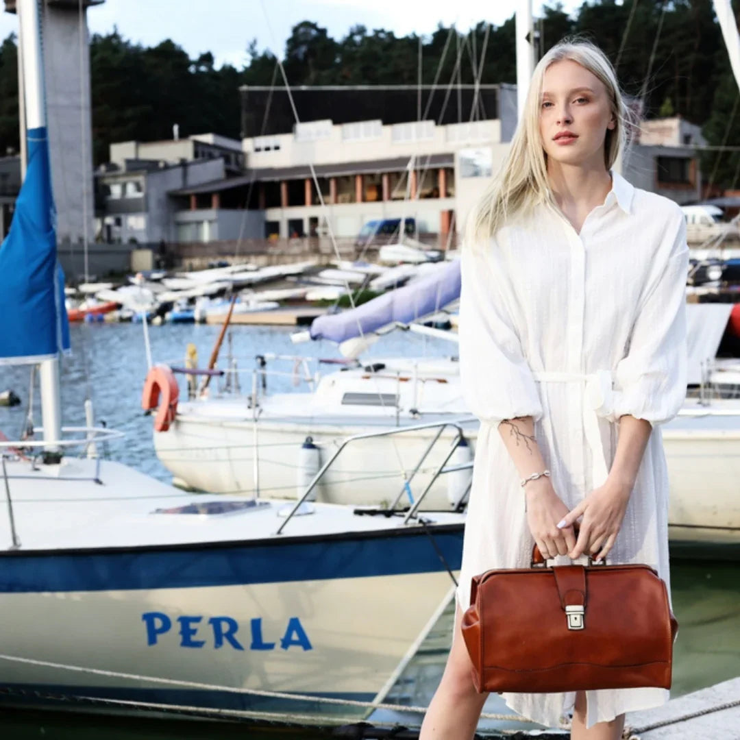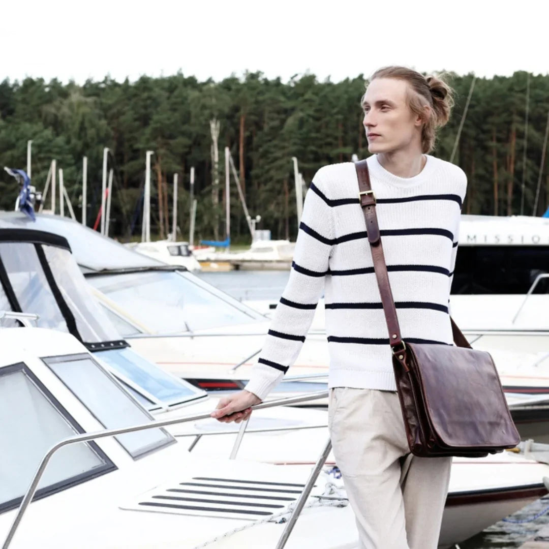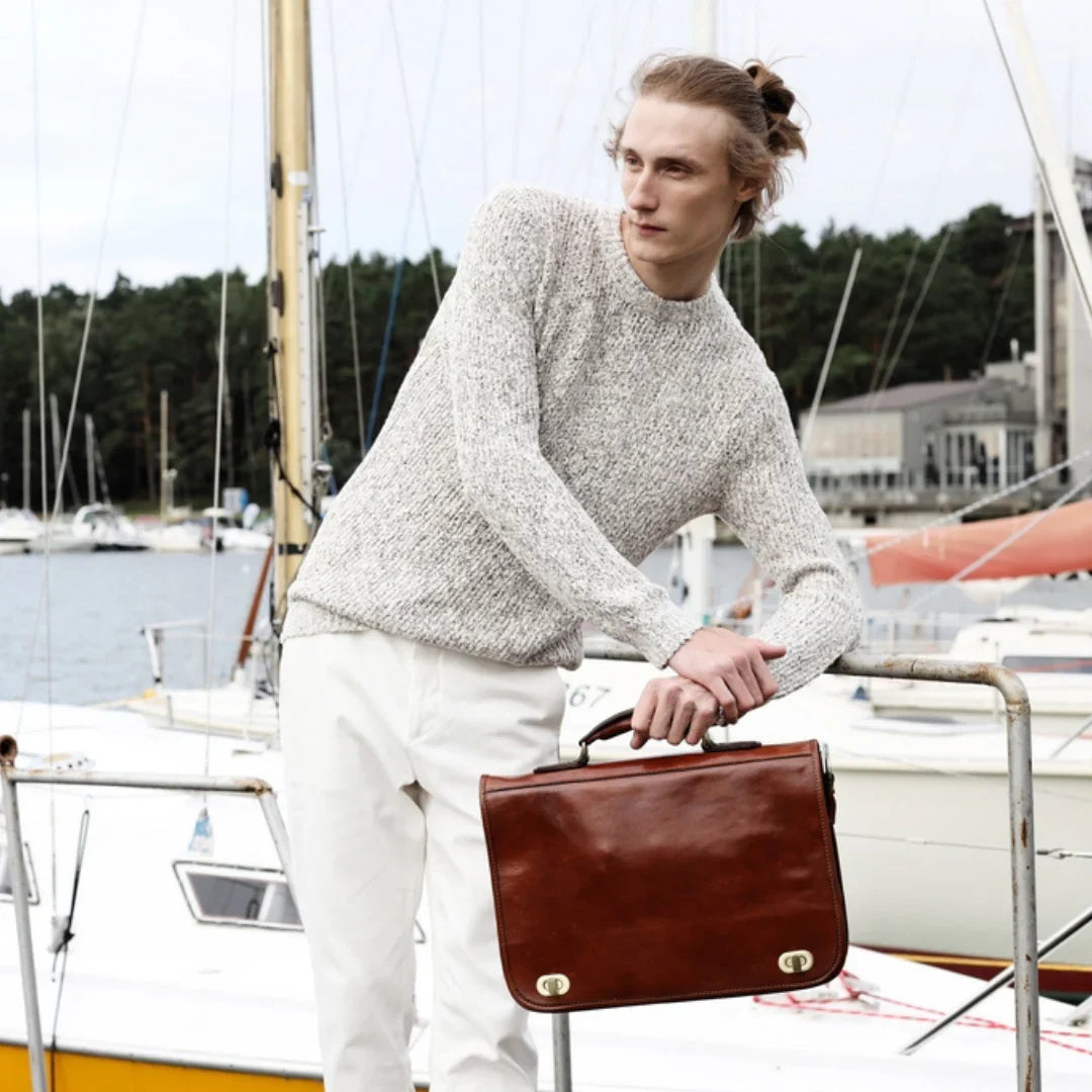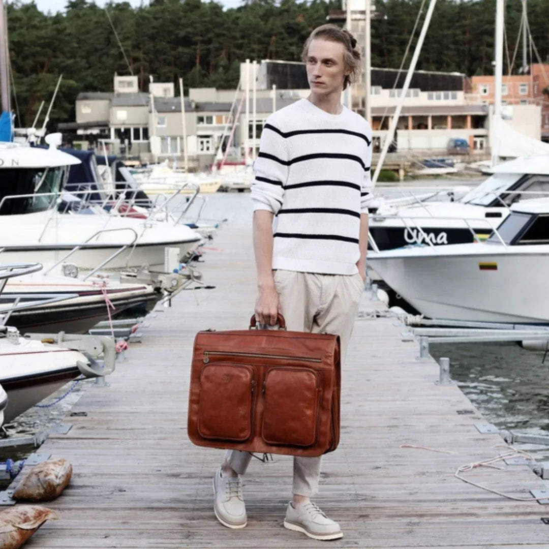 Nulla è più avvilente dell'idea che il classico sia sinonimo di noia. Pur prediligendo lo stile classico, si apprezza anche il piacere della spensieratezza — mantenendo uno spirito giovane (almeno nell'essenza). Attraverso questo servizio fotografico, si è voluto dimostrare come una borsa da viaggio in pelle italiana possa essere un'aggiunta perfetta anche alla collezione di uno spirito giovane. E quale modo più affascinante di viaggiare se non a vela? Basta uno sguardo alle immagini per percepire la brezza tra i capelli. Ah, poter rivivere i vent’anni!