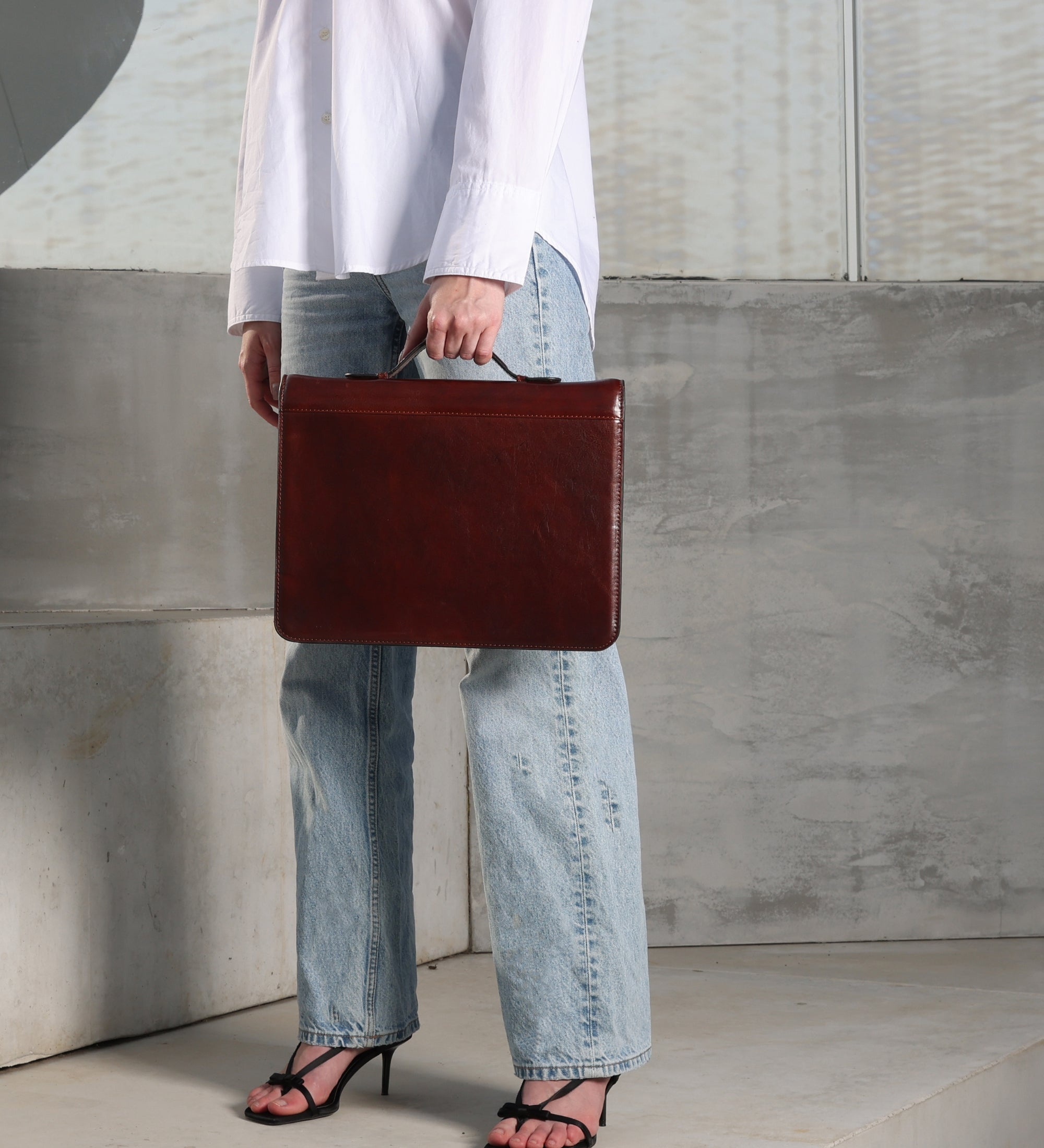 Il portadocumenti in pelle "Joy in the Morning" è un faro di ambizione professionale e fiducia. Realizzato con precisione e maestria, questo accessorio incarna l'essenza del successo in ogni cucitura. Il suo design slanciato e minimalista, accentuato da un manico raffinato, emana un senso di scopo e determinazione, preparando il terreno per il trionfo. Mentre se ne abbraccia la chiusura a cerniera, l'attesa cresce, accendendo il fuoco dell'ambizione. Aprendolo, si rivela un mondo di organizzazione su misura per le esigenze di un individuo proattivo. Ogni dettaglio denota meticolosa preparazione e attenzione ai particolari, riflettendo un'incrollabile dedizione all'eccellenza. Con il portadocumenti in pelle "Joy in the Morning", la luce del mattino diviene il palcoscenico in cui professionalità e aspirazione si fondono in perfetta armonia.